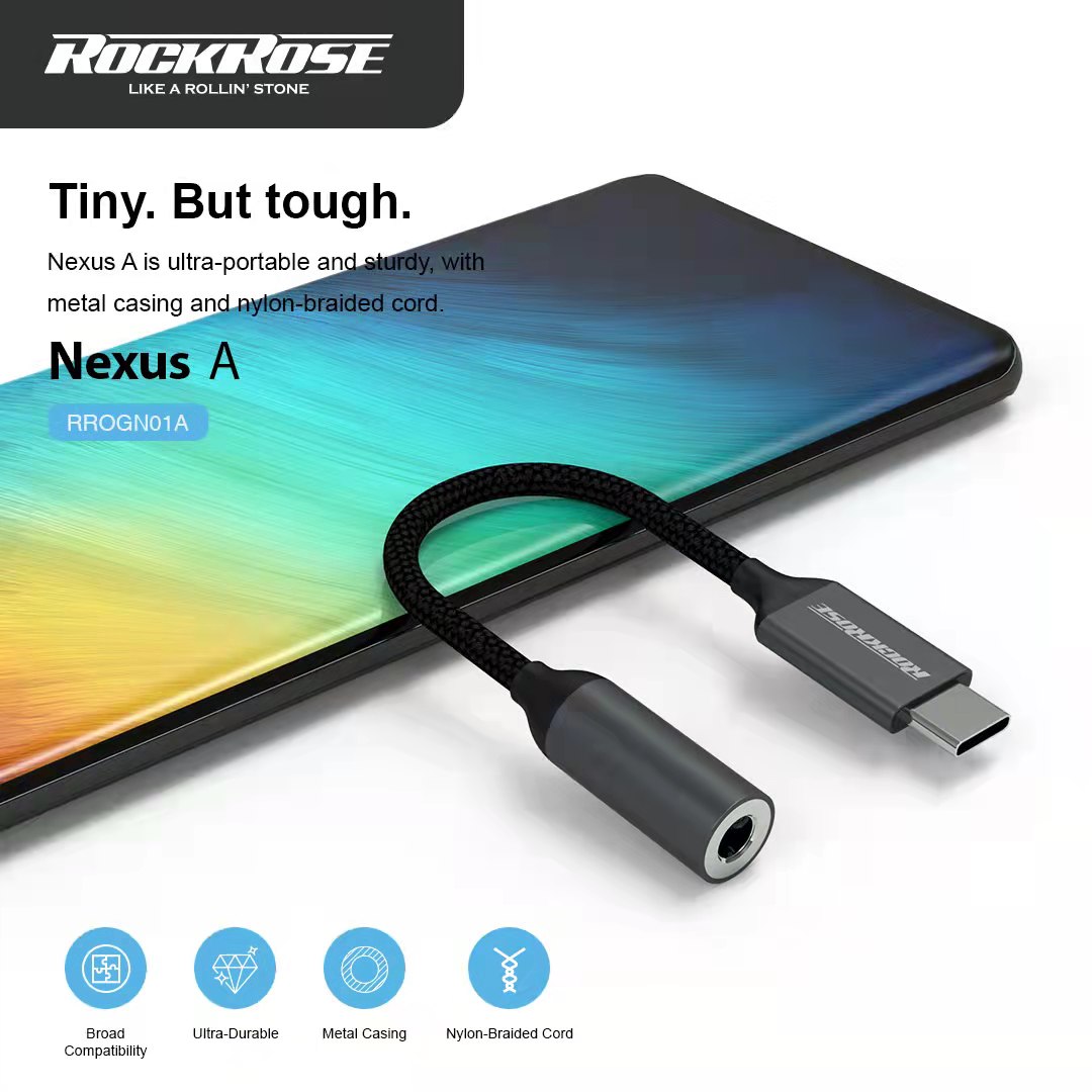 Nexus A is a USB-C to 3.5mm headphone jack adapter, featuring DAC chip, aluminum alloy casing, nylon-braided cord, and broad compatibility.